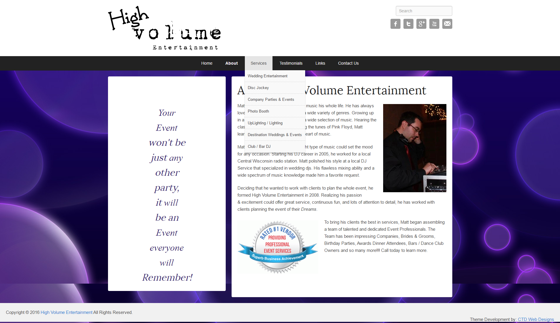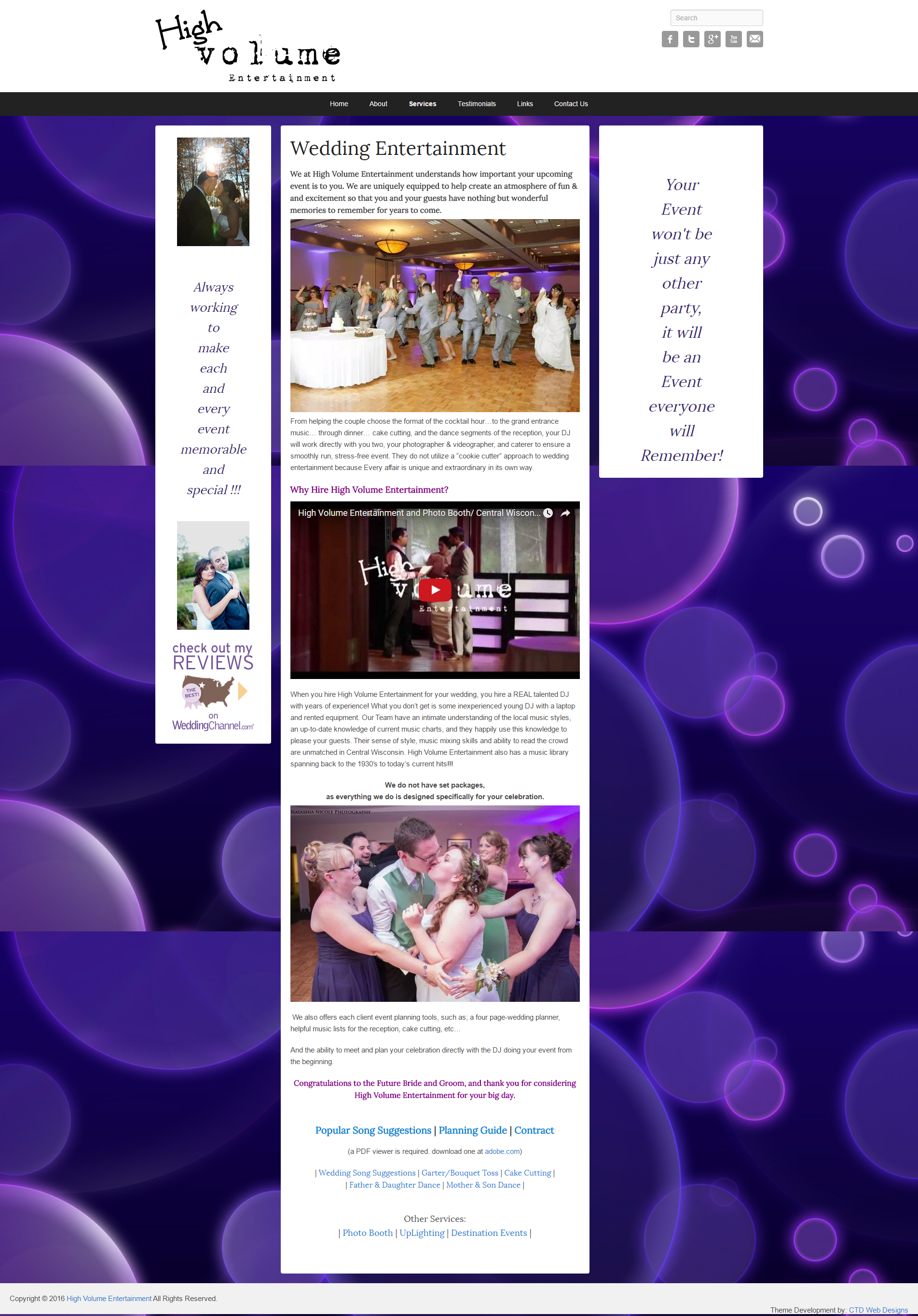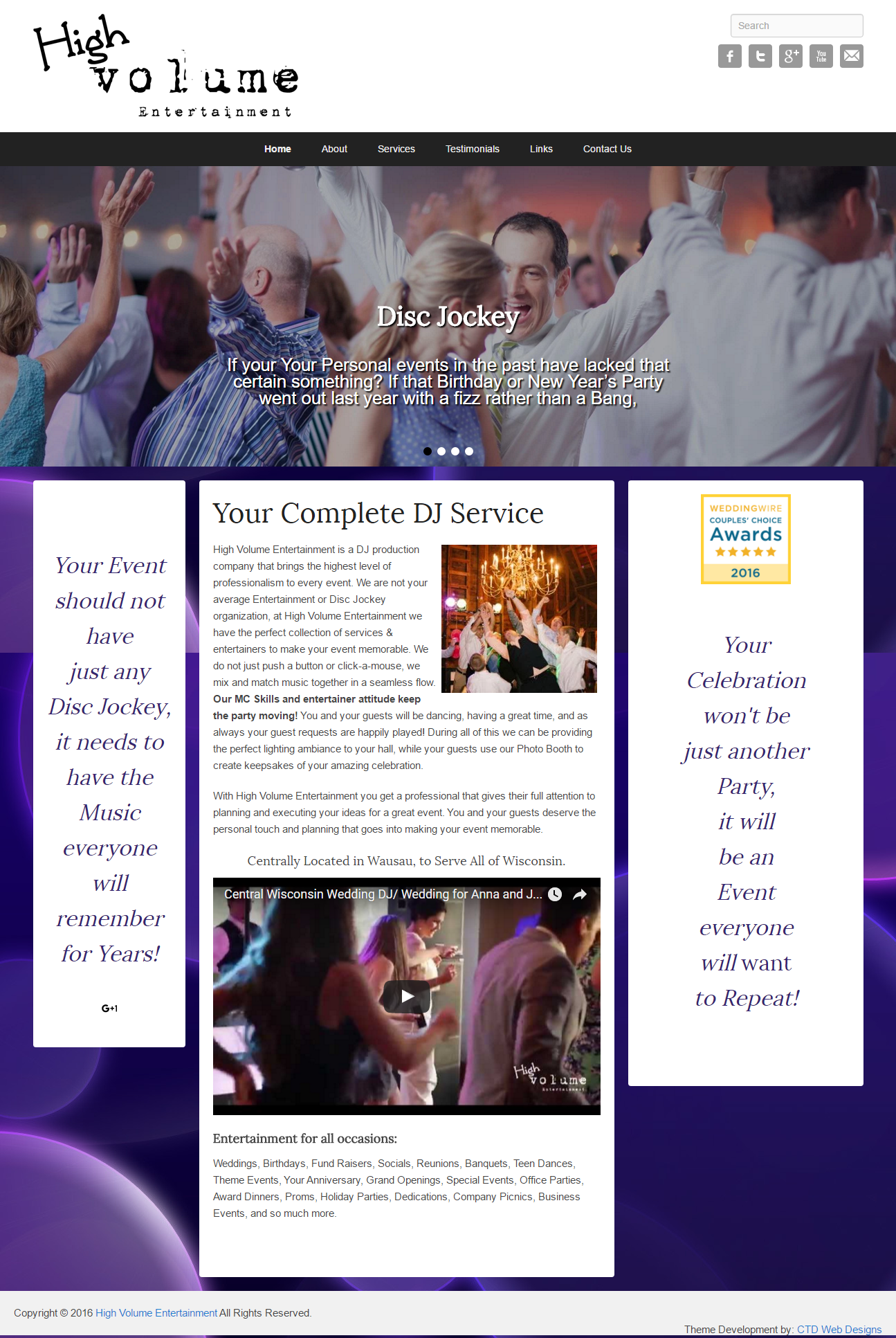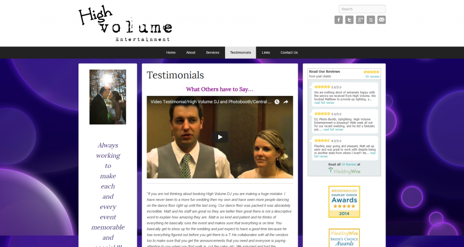 This website was created for a Disc Jockey (DJ) in Central Wisconsin to encompass his entire service offerings. One of the first things discussed was the importance of the mobile user. On this project the client chose to go with a WordPress Child Theme that we customized for his use & branding. We then worked with the client to rewrite all the copy on the website as well as integrate the testimonials from his Wedding wire account. Our team focused on creating several content templates for the editor to choose from when laying out content and applying them the pages already built out. The end result, a slick modern website with all the bells and whistles.