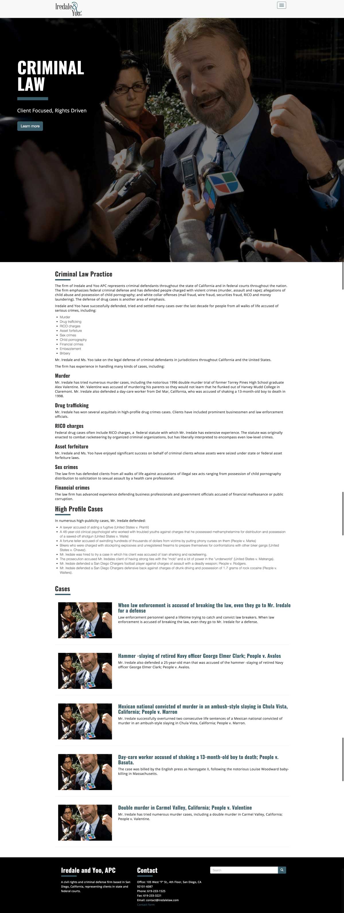 The legal representation industry for complex criminal or civil rights cases is vast and overwhelmed with information. The team at Iredale and Yoo, APC, a boutique San Diego law firm, needed a way to stand out from their competition. They engaged The Lakewood Group + CTD Web Designs to find a way to bring attention to the work they do representing their clients in state and federal courts throughout California. They will take your case to federal courts throughout the nation, if necessary to litigate the case for criminal defendants and civil rights plaintiffs. Working together we came up with a fresh and clean look to their modern website, that can scale with their firm into the future.